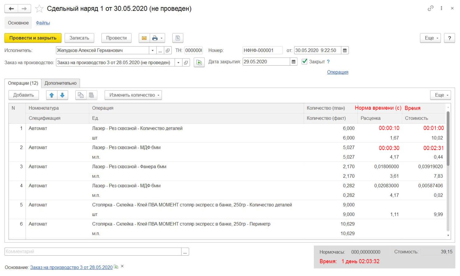 2. В заказе на производство в табличной части добавить эти данные. Внизу таблицы нужны общие суммы. Изображение 02