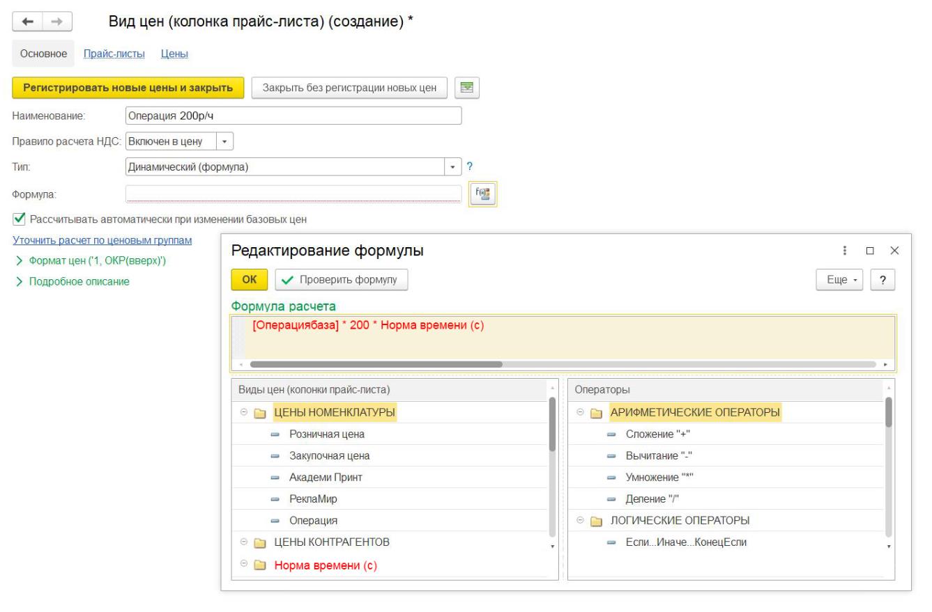 Но вот какой нюанс в программе! На вкладке виды цен я могу выбрать расчет динамической цены только на основании статической. Можно создать статическую цену с данными 1р. для каждой номенклатуры и тогда формула будет следующая: 1* 200 * 00:00:31 * 24 = 1,72 руб.