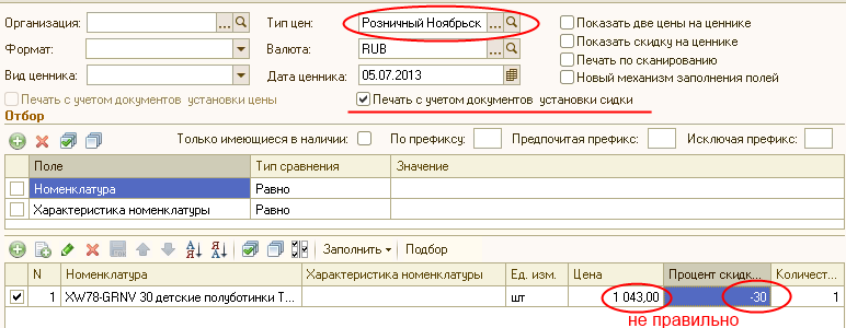 Имеется внешняя обработка, у которой есть опция "Печать с учетом установленной скидки" - которая выводит стоимость товара со скидкой. Но не учитывает указанный тип цен в соответствующем поле, это необходимо исправить. Подробнее см. приложенные файлы.