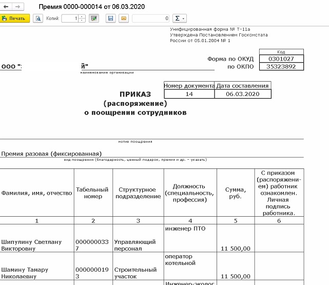 Есть типовой документ "Премия" и в ней печатная форма премии (принтскрин во вложении). Стандартная. Типовая.