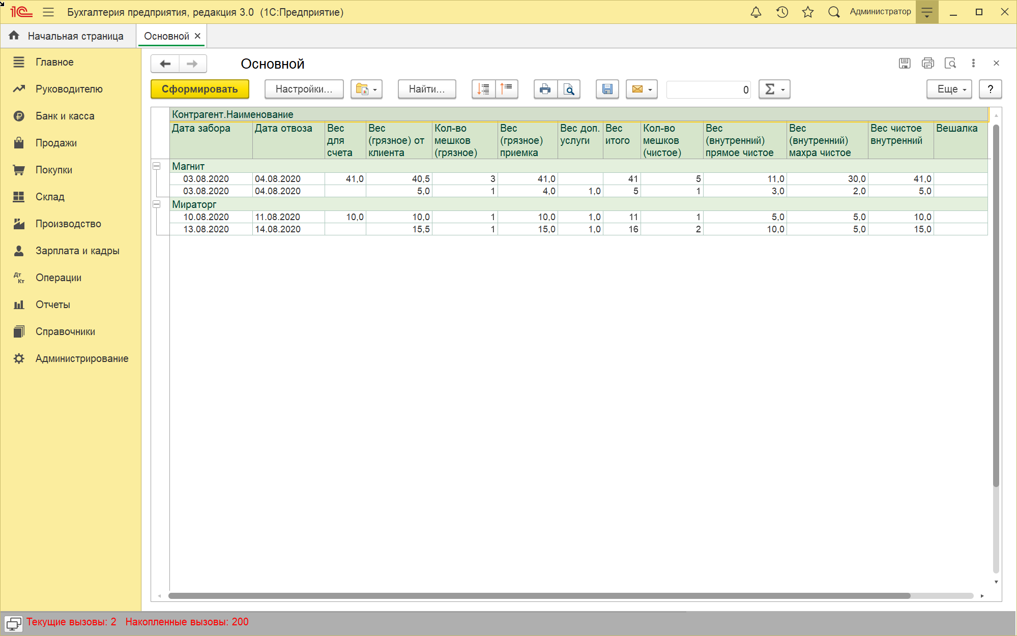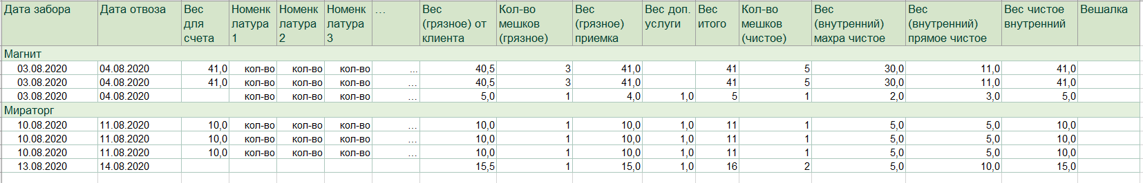 2) группировка по "Дата забора", "Дата отвоза" (суммирование строк внутри одинаковых пар одного контрагента)