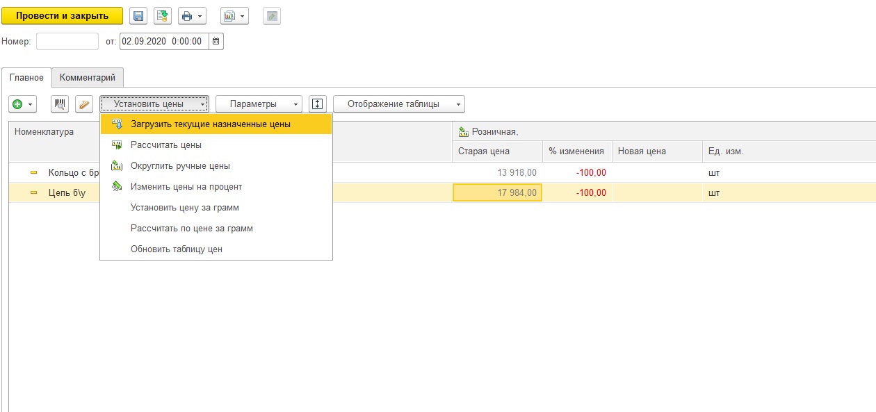 Допилить документ установки цен Розница Ювелирный магазин Рарус