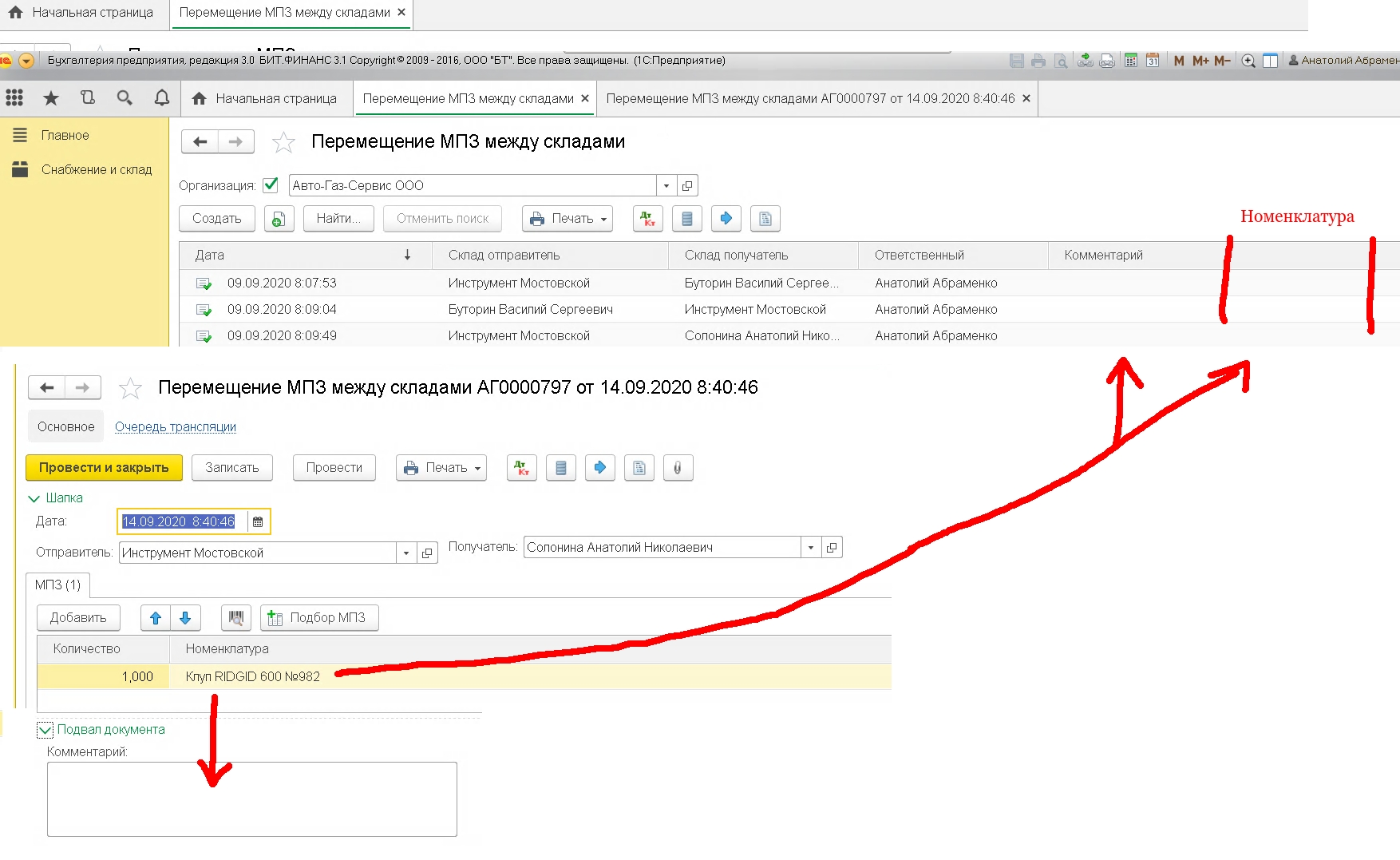 В документах перемещения в форму нужно добавить поле "Номенклатура", если не получится вывести отдельное поле под номенклатуру, можно чтобы она отображалась в "Комментарий" чтобы автоматически заполнялась.