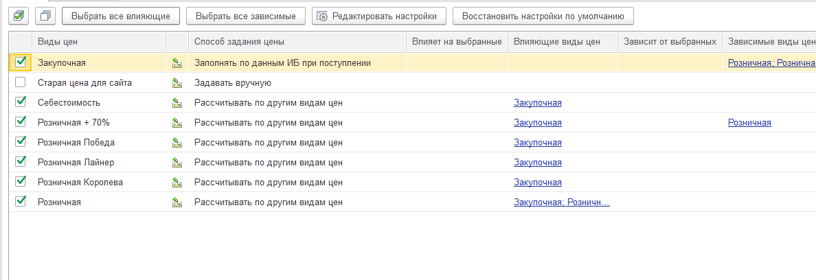в магазин Королева - автоматически устанавливались галочки расчета "закупочная", "себестоимость", "Розничная Королева"