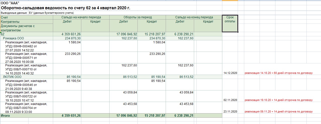 Нужно сделать внешний отчет "ОСВ по счету". - точно так же как и типовую. Единственное изменение - при формировании по 62 счету, нужно чтобы в конце добавлялся еще один столбец "Срок оплаты". И напротив каждой реализации должен проставляться срок оплаты по такому принципу: