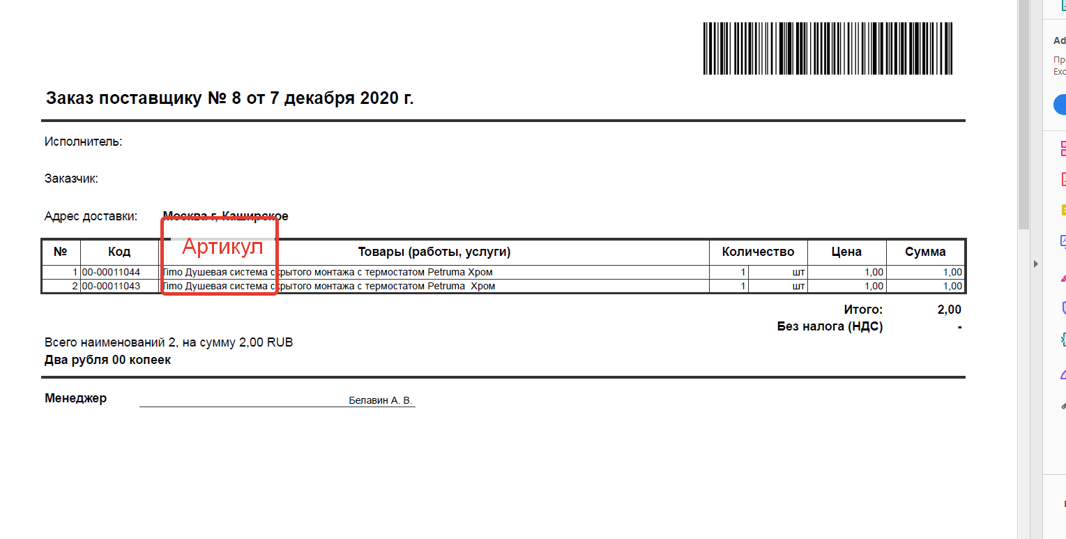 Требуется доработать печатную форму Заказ поставщику. Смотрите картинку