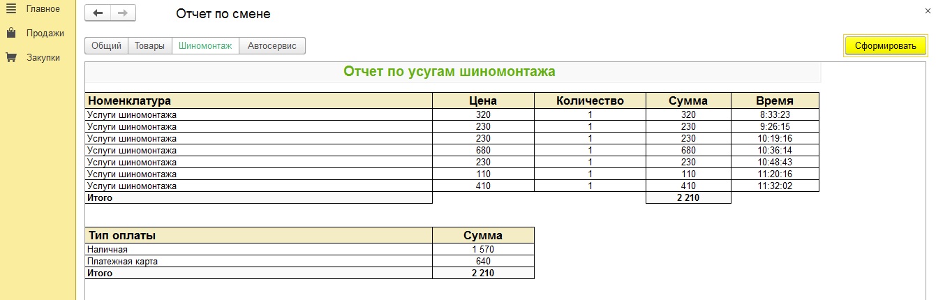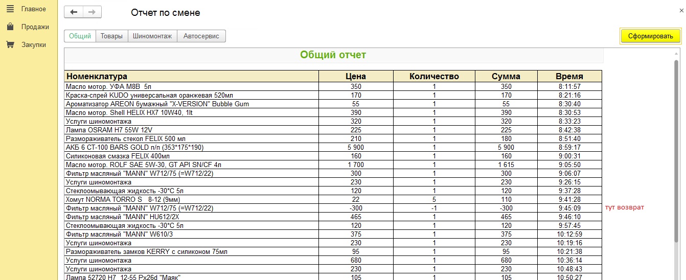 3)В РМК сделать отчет, фиксирующий продажи в течение дня по текущей кассе с вариантами отбора: общий, только товары, услуги автосервиса, услуги шиномонтажа. С информацией об оплате: карта, наличные, общая сумма. Возвраты также должны фиксироваться (минусоваться). Данная доработка была у нас реализована. Скриншоты приложены.