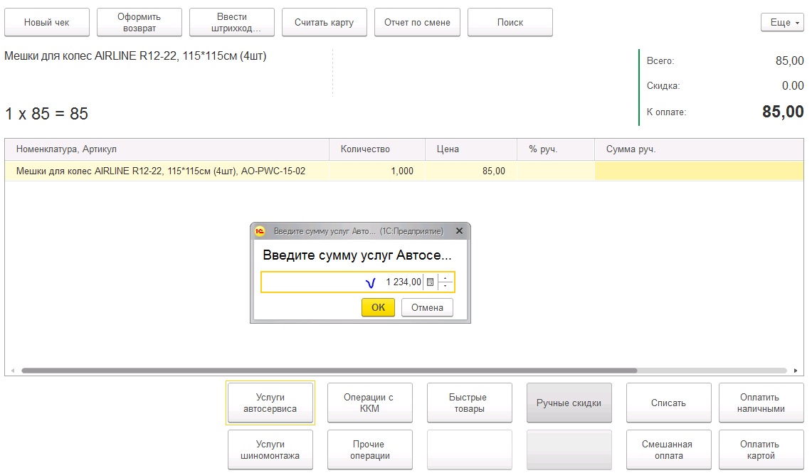 Описание: Кассир выбирает по кнопке необходимую услугу, открывается окошко для ввода цены, после этого соответствующая номенклатура переносится в чек с заданной ценой.