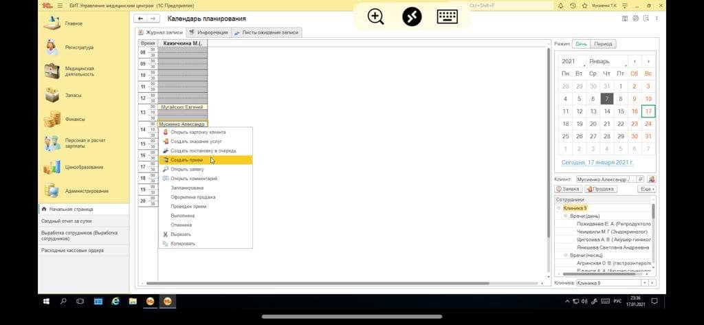 Конфигурация БИТ управление медицинским центром. Задача: есть отчет "Календарь планирования" при нажатии правой кнопкой мыши и выборе создать прием сейчас создается новый прием(если , нужно переписать кнопку так,чтобы открываля список "Ранее созданные приемы заявки". Скрины во вложении