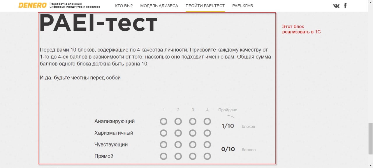 Необходимо реализовать возможность прохождения соискателем paei теста на стиль менеджмента. А именно нужно сделать вот такой тест http://paei.denero.ru/