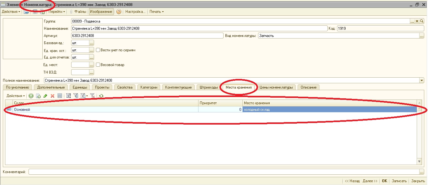 У номенклатуры есть поле "место хранения" (регистр сведений).