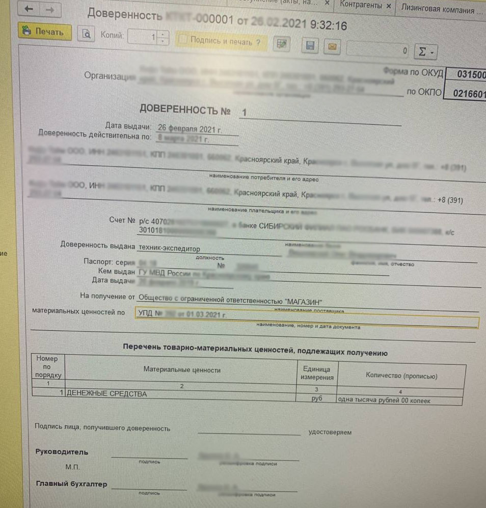 Требуется сделать внешнюю печатную форму доверенности на получение денежных средств по документу Реализация товаров.