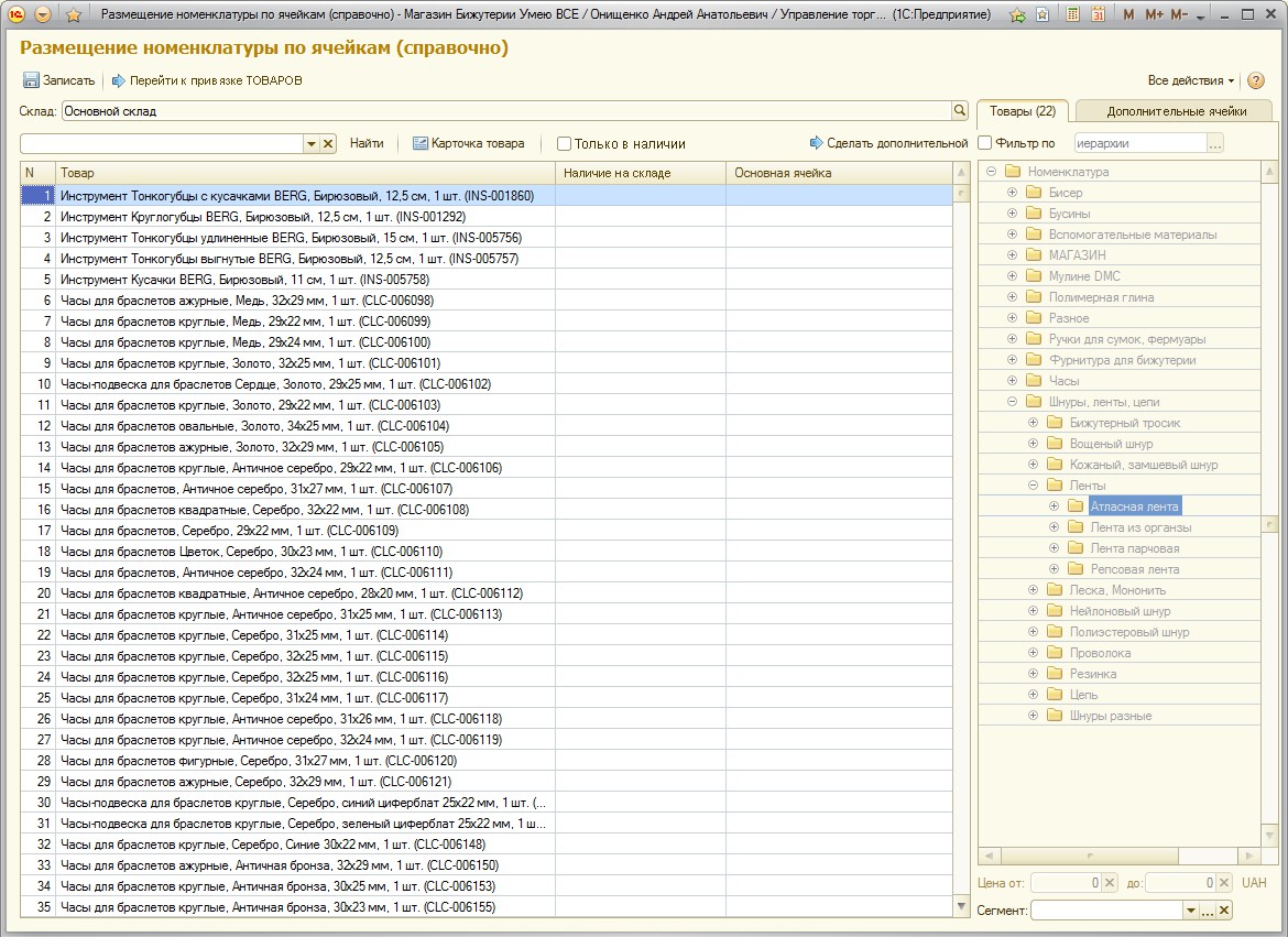 Порядок работы привязки Ячеек к товару должна быть как в стандартной "Размещение номенклатуры по ячейкам (справочно)"