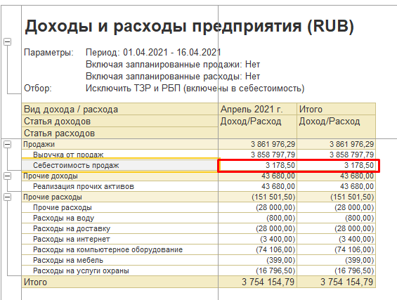 УТ11.4 отчет "Доходы и расходы предприятия" с расчетом себестоимости по последним...