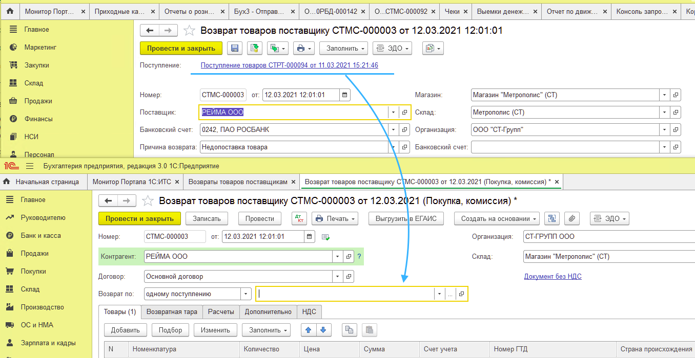 При выгрузке из РТ2 в Бух3 возвратов поставщику не выгружается документ-основание.