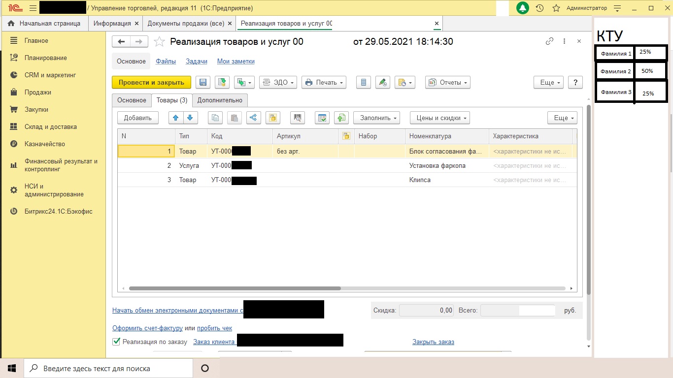 Сделать возможность оценивать объем выполненных работ и проданных товаров (Коэффициент трудового участия (КТУ)) одновременно для нескольких пользователей по каждой строчке в списке товары в документах (Реализация товаров и услуг).