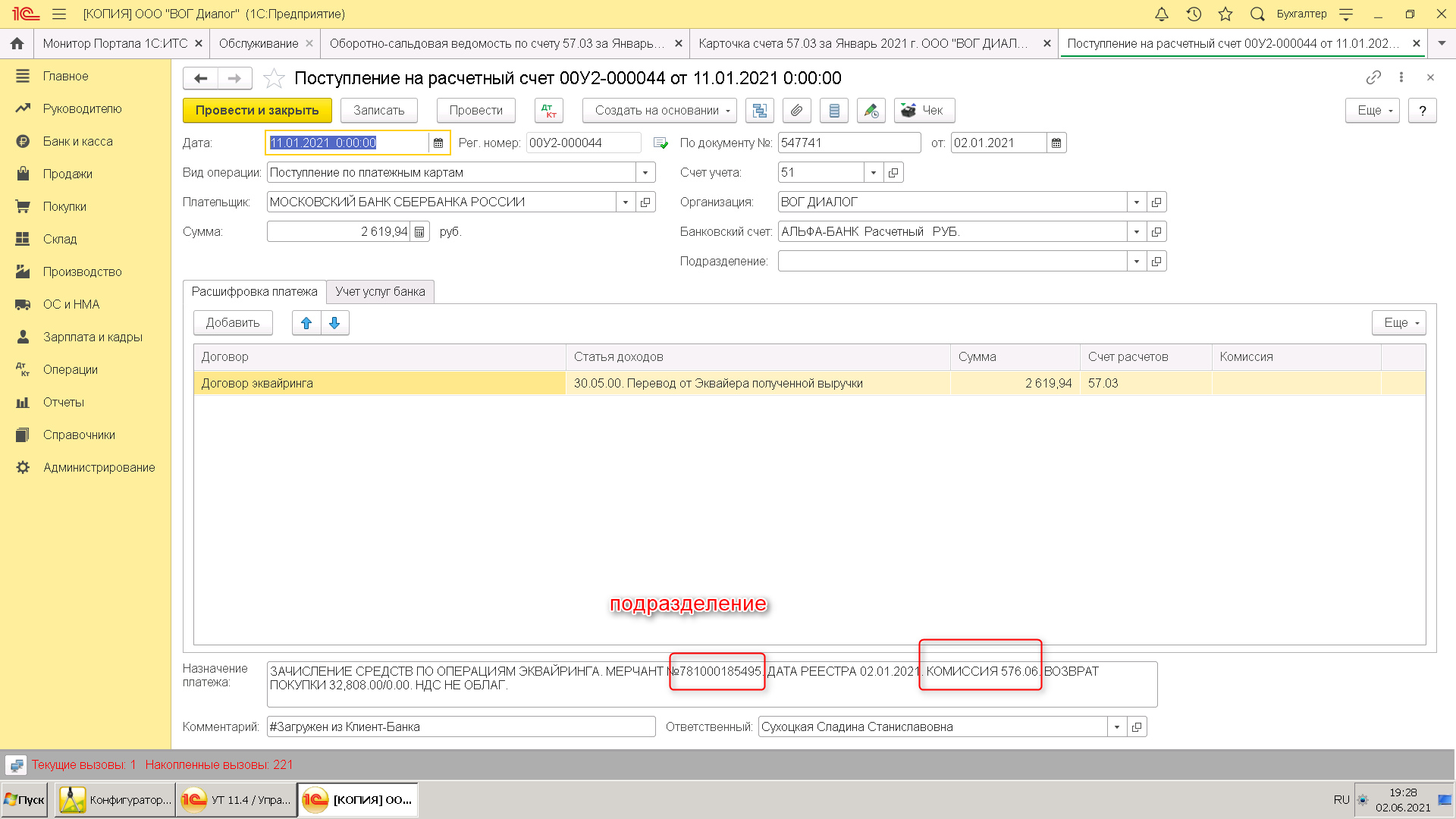2.Некоторые документы Поступление на расчетный счет, также имеют не заполненный реквизит Подразделение, но при этом заполнить его можно только на основании "назначения платежа"(текстовое поле) там текстом указан номер, по которому можно найти подразделение. (табличка в экселе или текстовый документ)