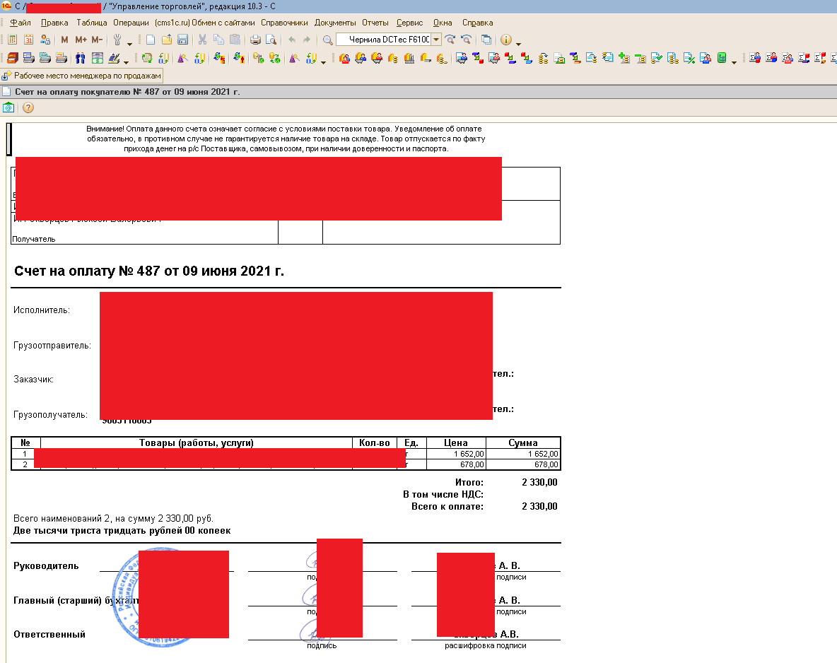 У нас уже настраивали вывод печатей и подписей в счете на оплату. Теперь тоже самое нужно сделать для Акта выполненных работ и торг-12. У нас в одной программе ведется учет по двум организациям. И соответственно должны подставляться 2 печати в зависимости от организации.