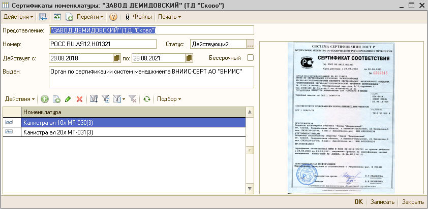 Нужно добавить к выгрузке сертификаты номенклатуры.