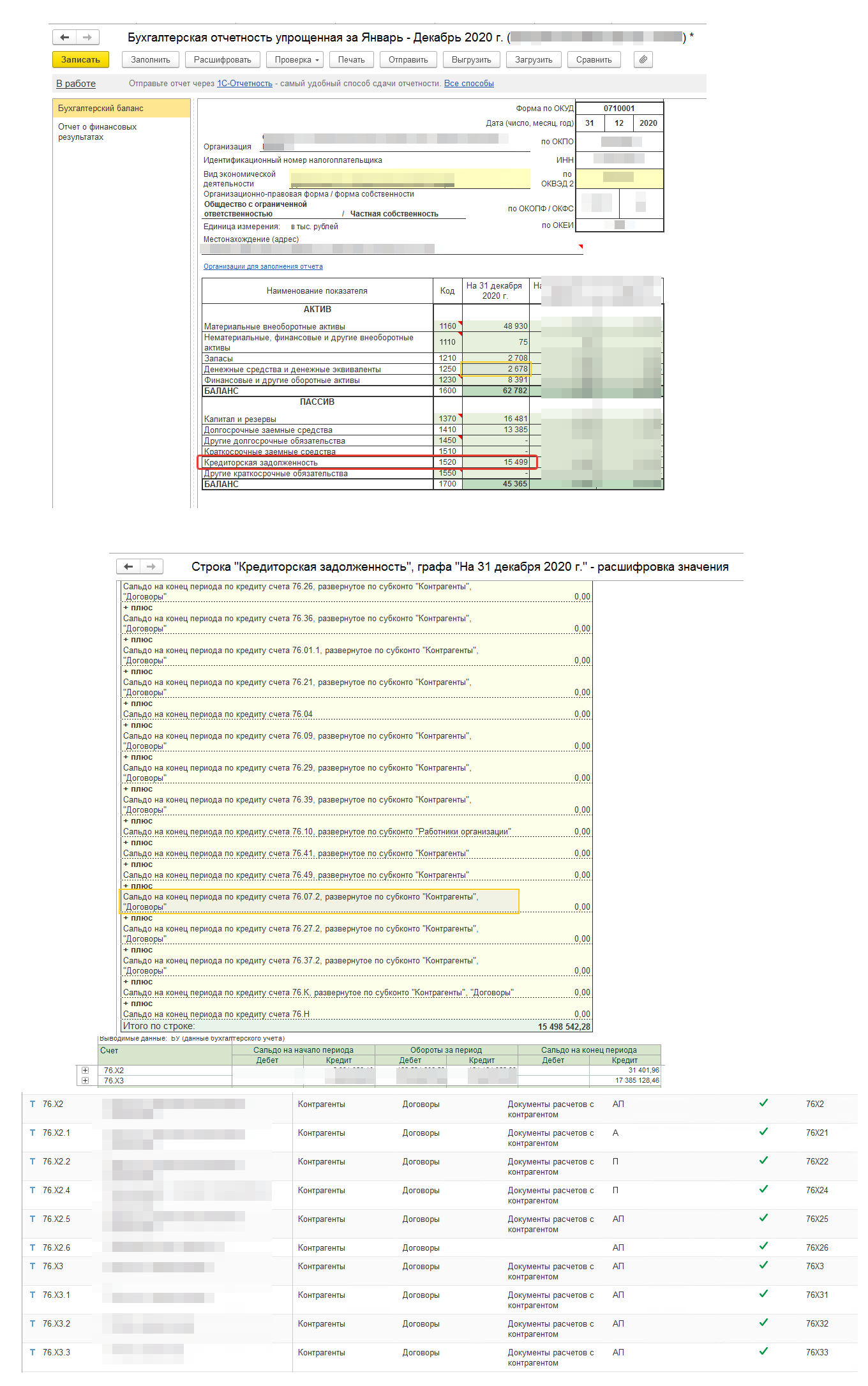При заполнении отчета «Бухгалтерская отчетность упрощенная» (регламентированные отчеты) в расчет по строке 1520 не попадает сальдо на конец периода по пользовательским субсчетам к счету 76 76.Х2 76.Х3