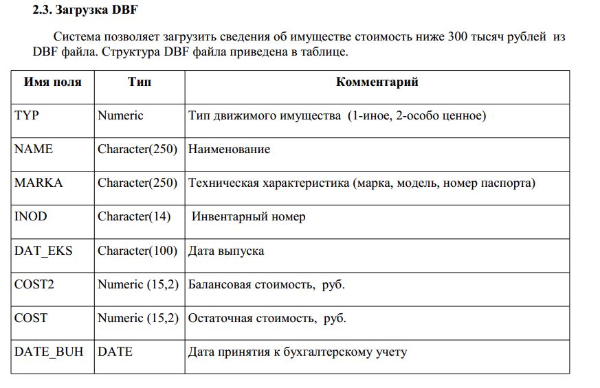 Нужно сделать внешнюю обработку для выгрузки основных средств из БГУ в формат dbf. (описание файла во вложении) В обработке должна быть возмжность выгрузки как по одному учреждению, так и по всем, но при этом, на каждое учреждение должны формироваться отдельные файлы, также возможность выбора даты выгрузки. В файл должны выгружаться все основные средства состоящие на балансе, соответственно ОС на выбранную дату списанные и на забалансе нет.