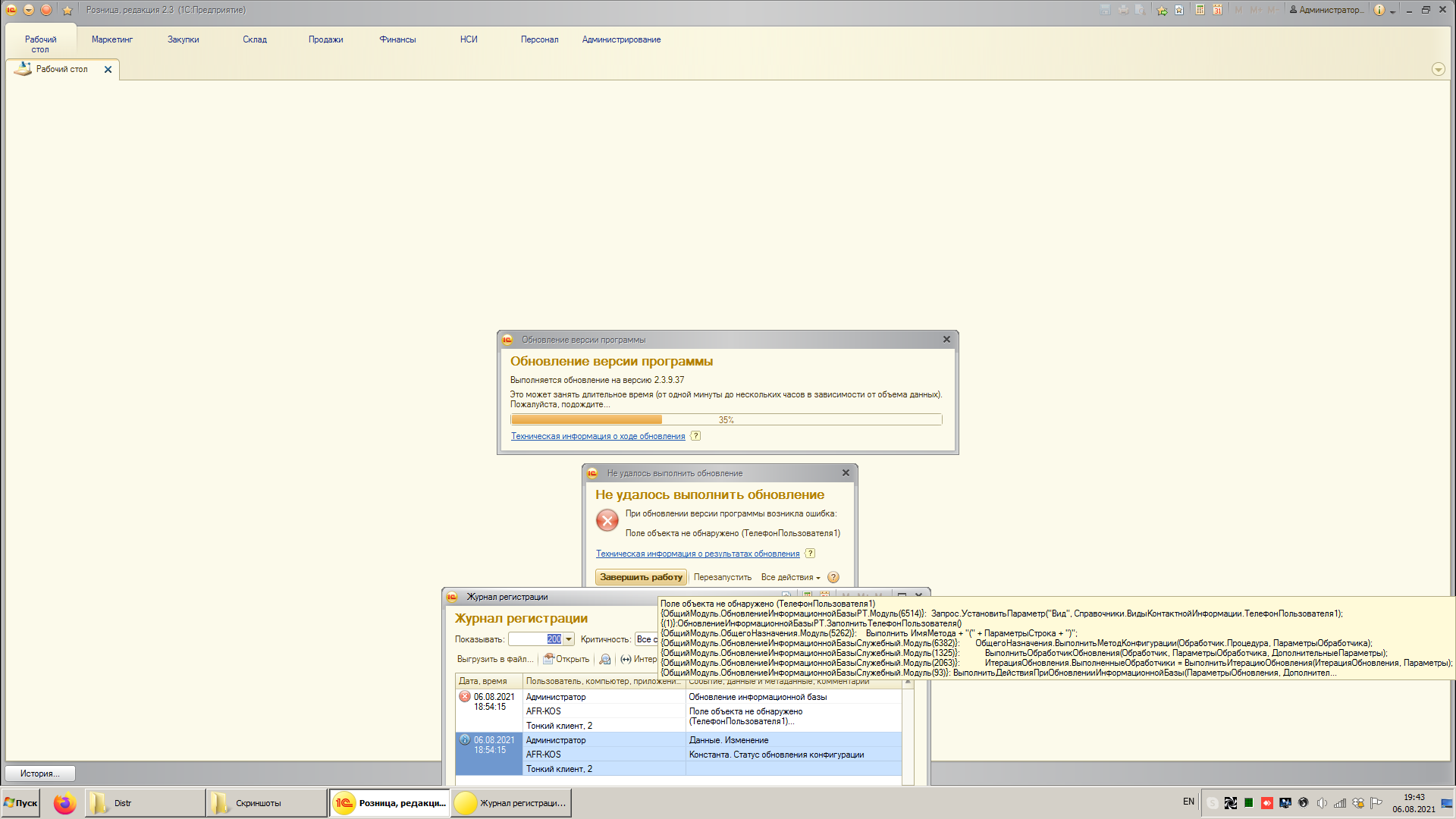 При обновлении клиентов (через файловую синхронизацию) в конце обновления вылезла ошибка