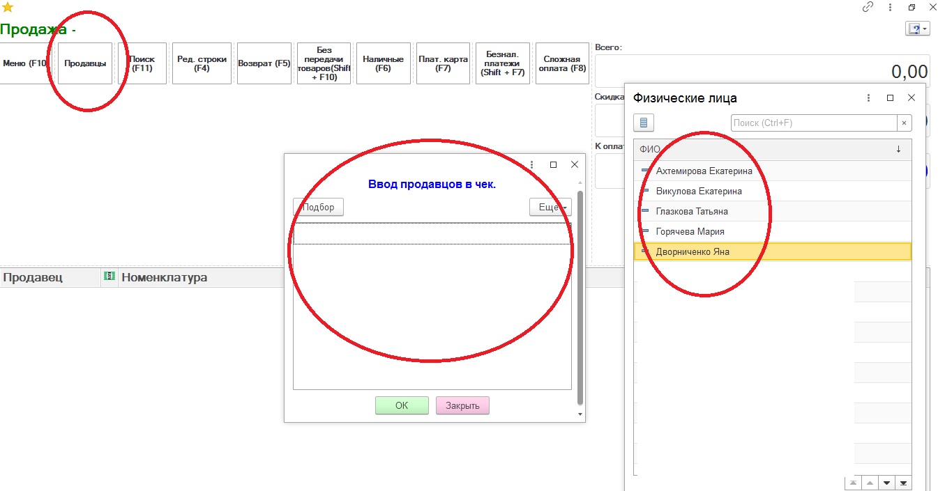 Сейчас продавцы добавляются подбором. Продавцы - это справочник физлица. Нужно сделать возможным присвоить продавцам штрихкоды, распечатать список - продавец и его штрихкод, и чтобы в окне подбора продавцов "ввод продавцов в чек" можно было отсканировать штрихкоды и продавцы должны туда попасть без нажатия кнопки подбор.