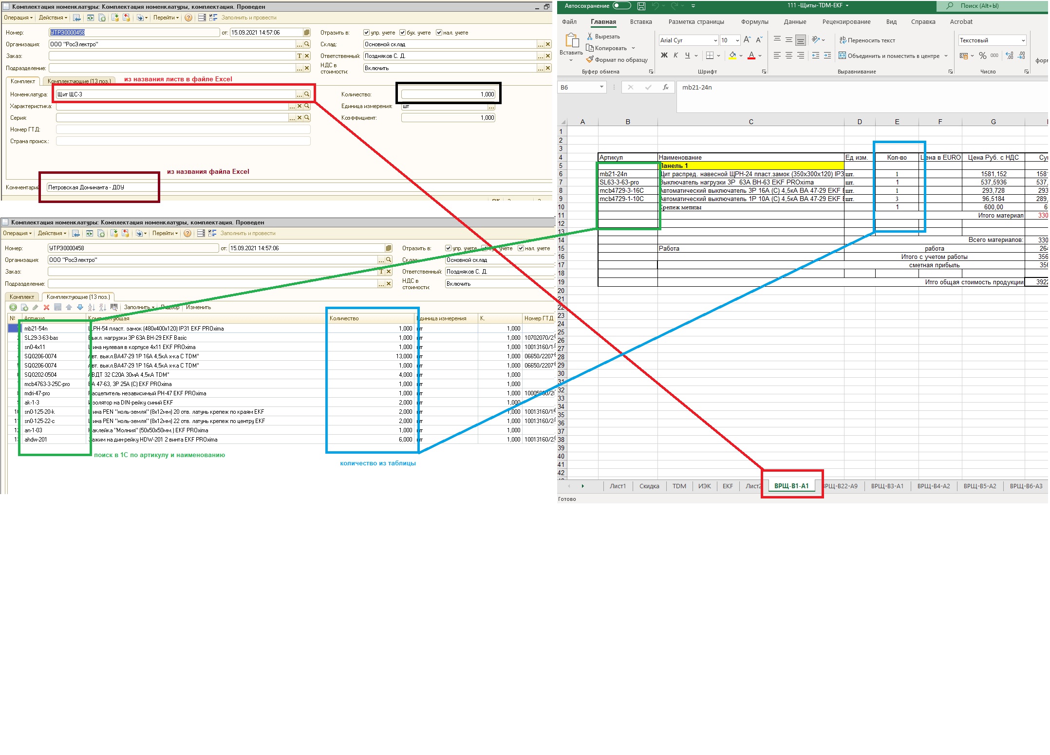 3. В табличной части - товар заполняется по данным из из соответствующего листа, поиск сначала по артикулу потом по наименованию, количество заполняется из таблицы соответствующего листа.