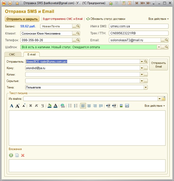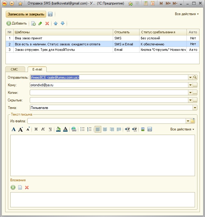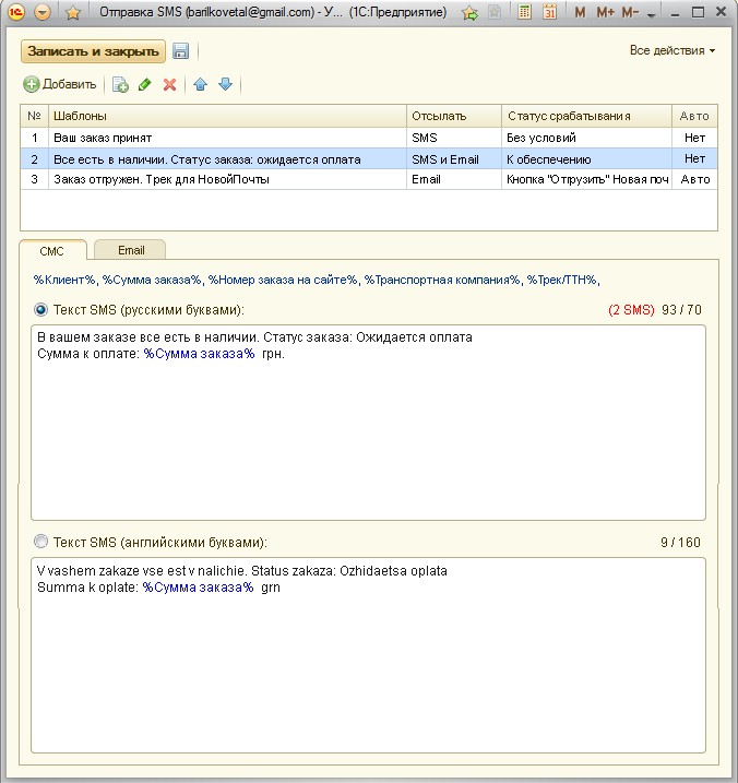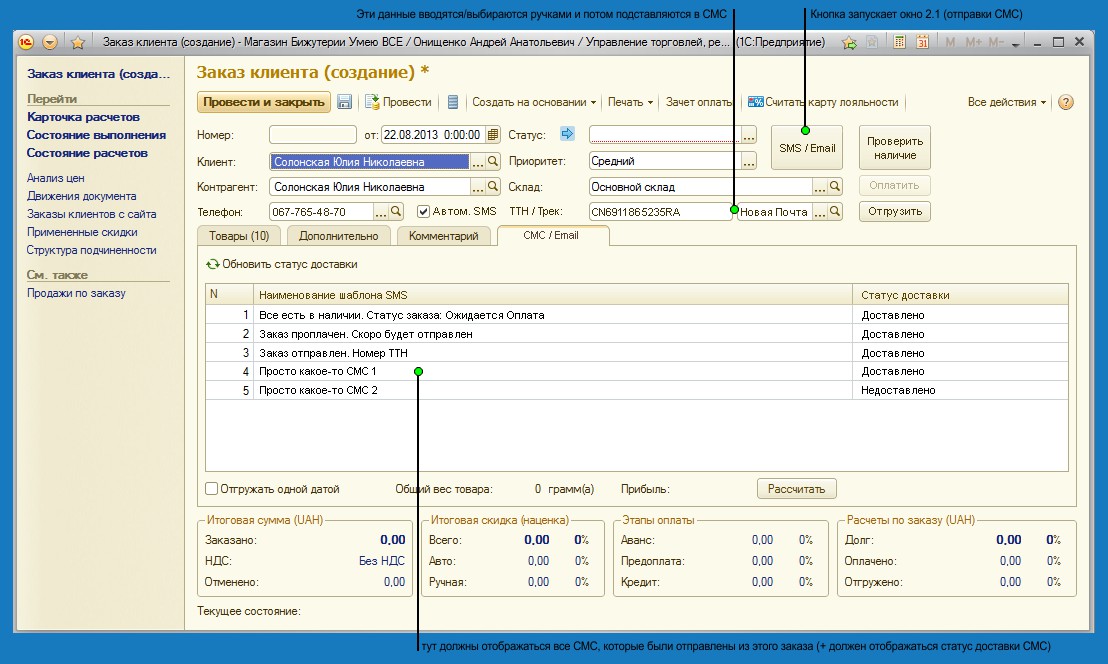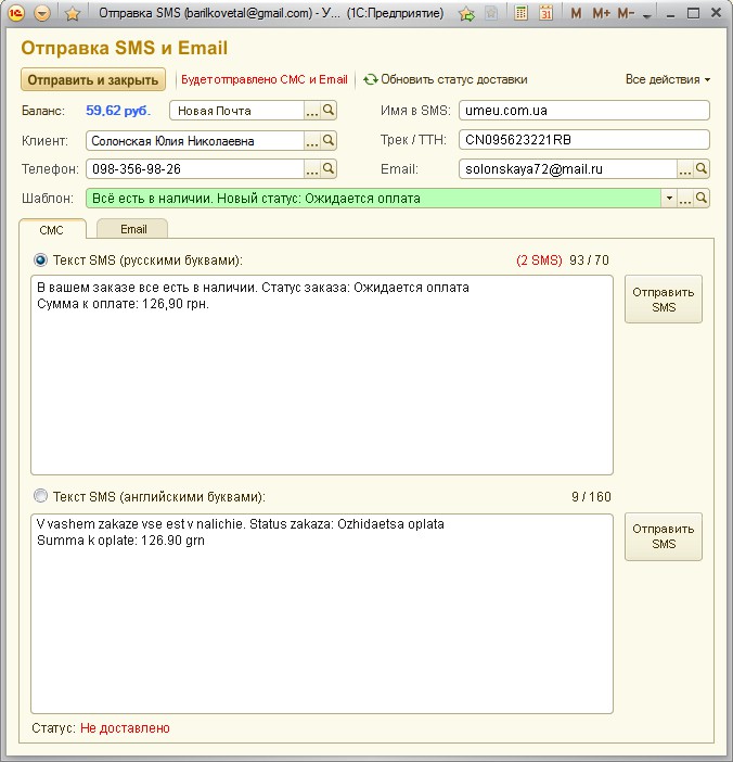 Открывается окно "отправки СМС" Получатель и телефон берутся из свойств Заказа, шаблон выставляется на основании текущего статуса заказа.