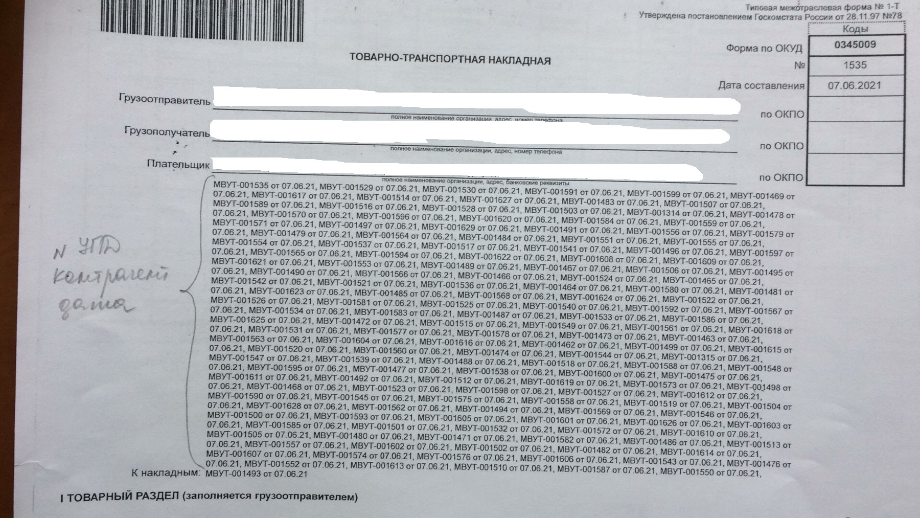 Необходимо написать обработку печати ТТН по нескольким документам. В обработке должен быть предусмотрен отбор РТиУ по организации, контрагенту, договору и дате. Смысл в том, чтобы можно было выбрать необходимое количество документов и вывести их на печать в одну ТТН. В шапке добавить поле "К накладным", куда будут выводиться номера и даты всех выбранных документов. А в табличную часть необходимо вывести всю номенклатуру из всех выбранных документов. Фото прилагаются.
