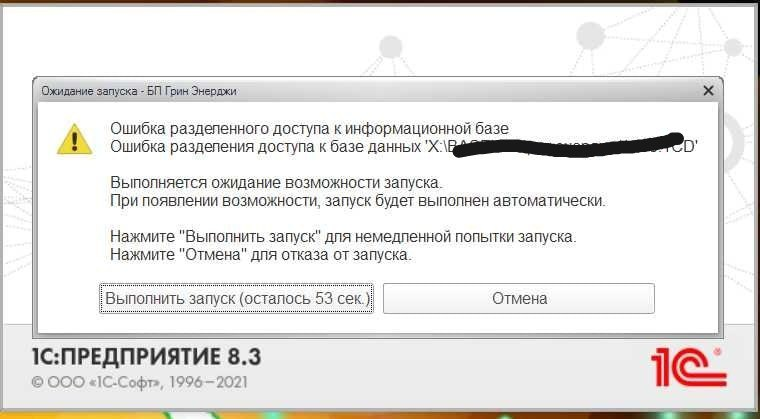 Устранение ошибки разделенного доступа к информационной базе.