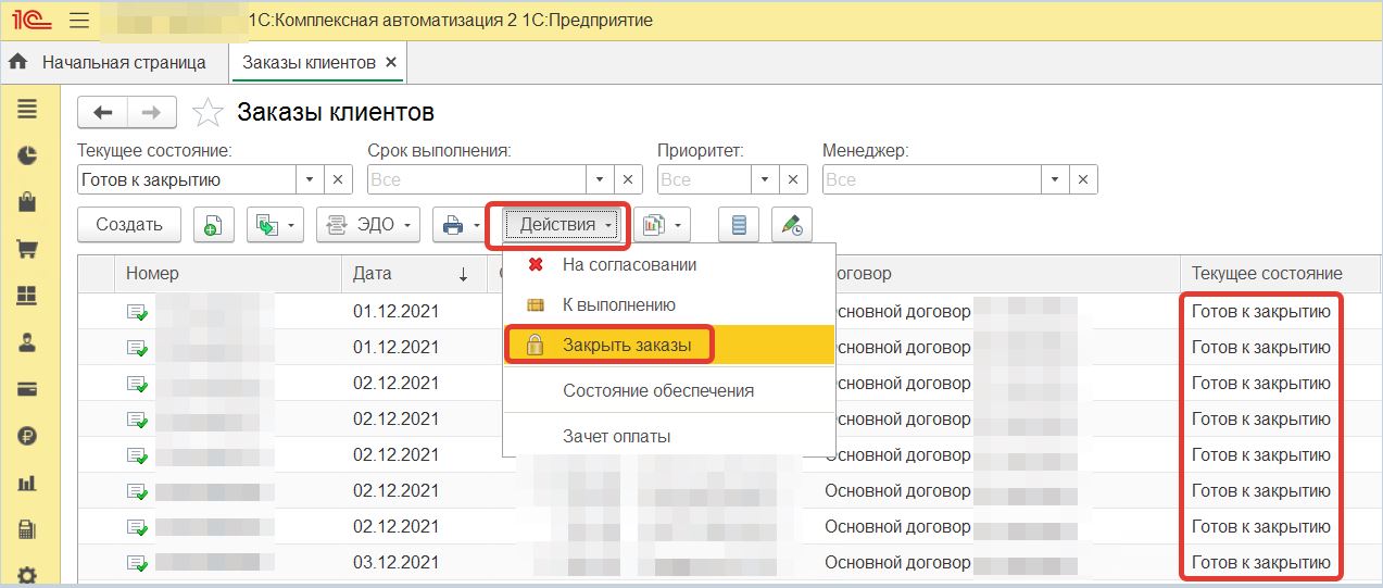 Требуется разработать через расширение Регламентное задание в КА2, которое будет имитировать работу пользователя по закрытию "Заказов клиентов", находящихся в состоянии "Готов к закрытию".