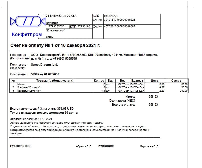 ВАЖНО! Вес в печатной форме = Вес в номенклатуре * Кол-во в реализации. Т.е мы продаем 8 шт. Шин, а в номенклатуре Шина весит 10 кг., то в печатной форме в колонке Вес должно быть 80 кг. (8 шт * 10 кг)