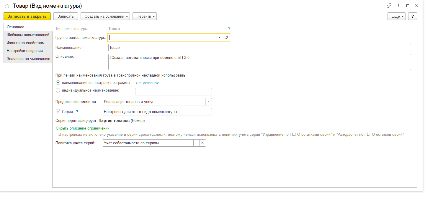 Задача настроить учет по фифо чтобы автоматически ставилась серия при продаже товара,сейчас только вручную дает выбрать. Сейчас так же не работает кнопка "заполнить серии по Fefo" в реализации,пишет "в табличной части нет товаров по которым серии можно заполнить по fefo". Нужна помощь по настройке только,доработки не требуются.Настройки вида номенклатуры приложил на картинке.