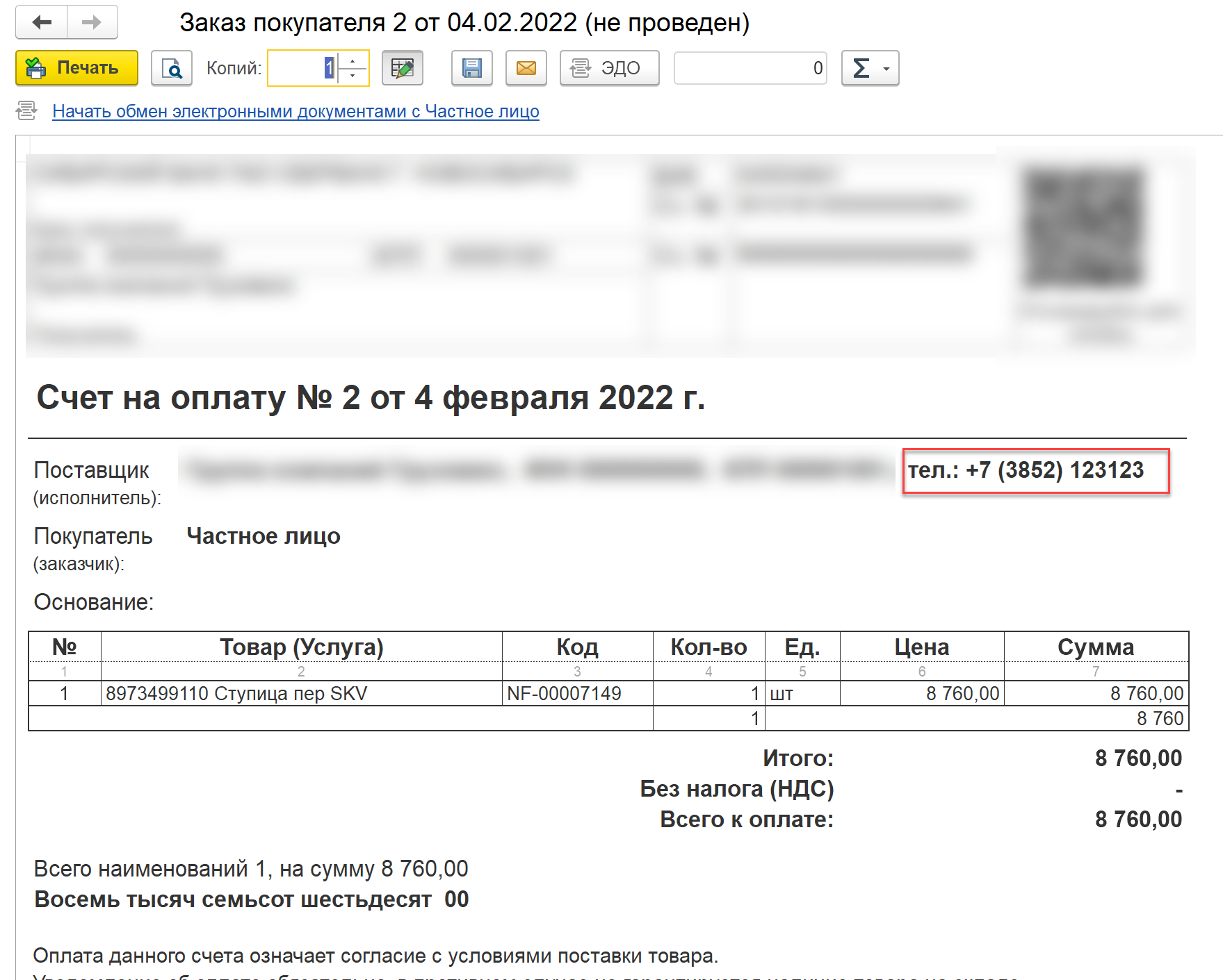 Этот же телефон выводится в печатной форме счета на оплату, см. Скрин002.