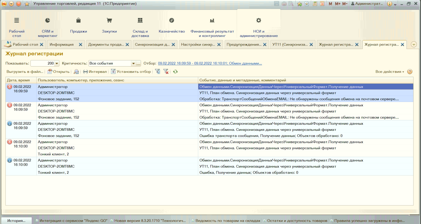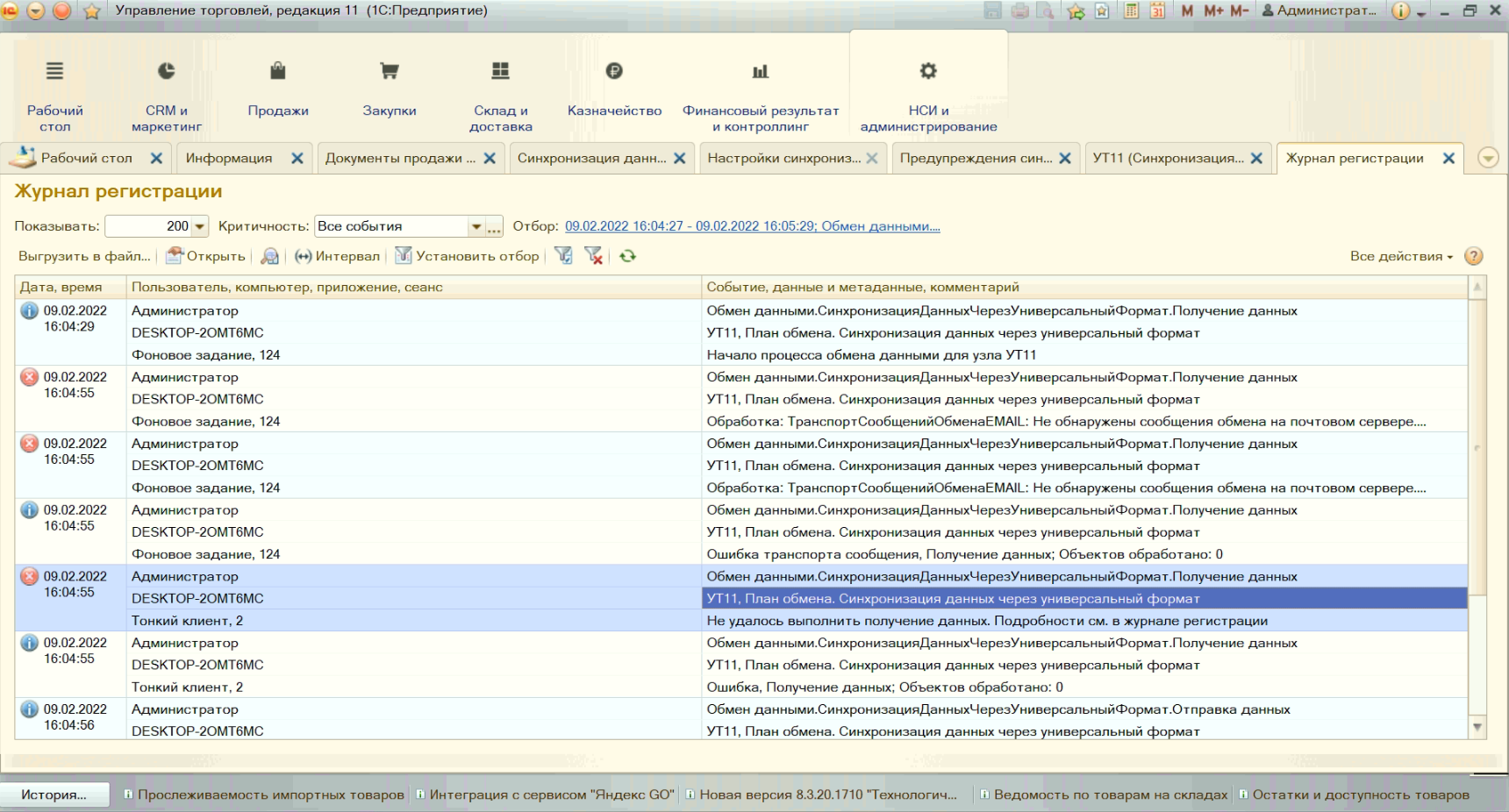 Скорее всего проблема в том, что при попытке обмена, какие-то данные не соответвуют формату. Не правильно заполены. Могу посмотреть, но стоимость огласить смогу только после осмотра. Всё зависит от масштабов проблемы. Бывает, что всего один элемент мешает.