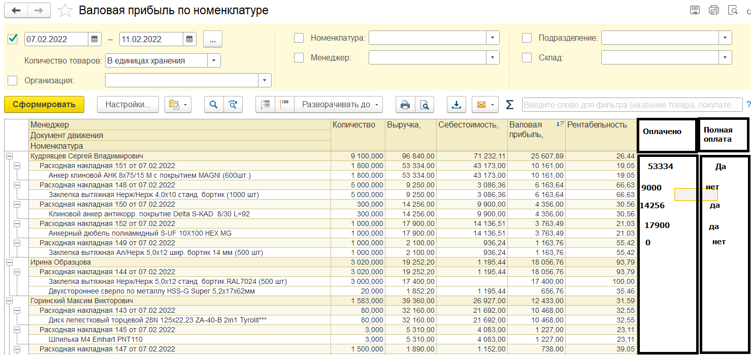 В УНФ есть отчет Валовая прибыль. Нужно сделать такой же внешний отчет для фреша и добавить 2 колонки: 1) Сумма оплаты по расходной накладной 2) полностью оплачено или нет. Пример отчета во вложении. При этом сохранить все возможности настройки, которые есть в типовом отчете, изменение структуры, добавление показателей, отборы...