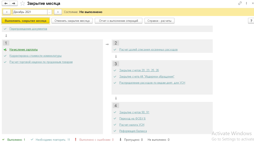 Бухгалтерия 3.0 - при закрытии месяца не проводится документ