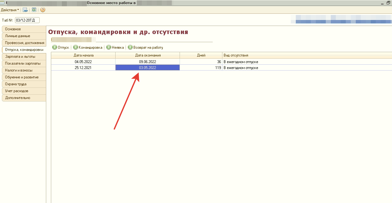 В карточке сотрудника есть вкладка "Отпуска", в ней отображаются документы по отпускам (дата начала/конец). В карточке сотрудника, окончание отпуска показывает одну дату, при переходе в документ, другая дата. В списке документов отпусков, показывает правильную дату (та что в самом документе), а вот в самой карточке сотрудника, другая дата. Проблема только у одного сотрудника.