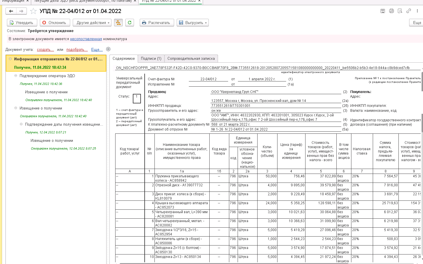 Входящую накладную в xml формате прилагаю «ON_NSCHFDOPPR_2AE778F532F-F42D-42C0-9370-B0CCBA8F70F9_2BM-7735512618-2012052807205571581080000000000_20220411_be5506b2-b5b3-4e18-844a-c8b9dced7cfb.xml»