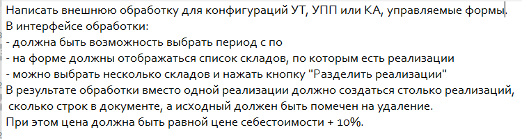 В результате обработки вместо одной реализации должно создаться столько реализаций, сколько строк в документе, а исходный должен быть помечен на удаление. При этом цена должна быть равной цене себестоимости + 10%.