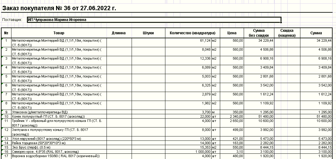 Но в новой версии печатных форм, должна отображаться только колонки Длинна (м), Штуки, с теми данными, которые были вбиты в документе. Так же должны отображаться данные в колонке Количество, в которой идет произведение трех колонок.