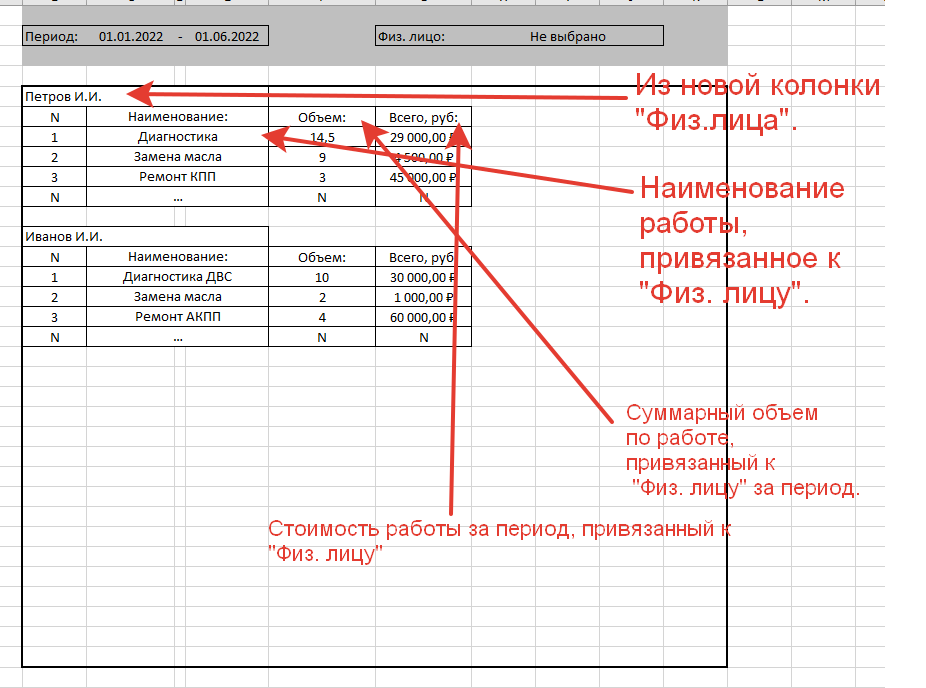 Отчет должен отобразить за период, данные по работам конкретного физ. лица из табличной части "Работа", где работы должны будут суммироваться в объеме и стоимости суммы. То есть, суммарно отдельная работа за весь период.