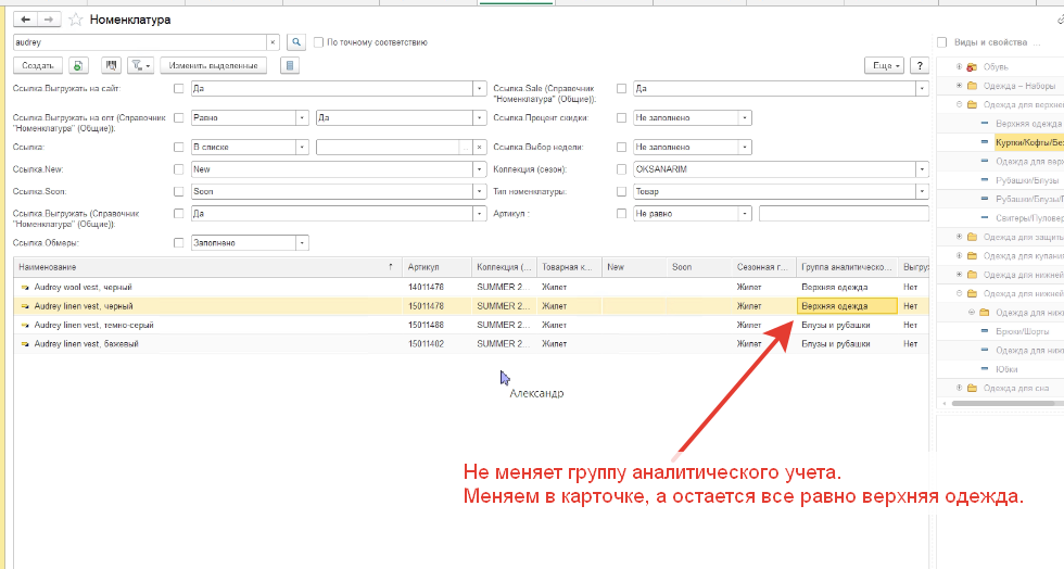3) В карточке номенклатуры, не меняется "аналитический учет". То есть, его меняют, а он обратно встает при сохранении.