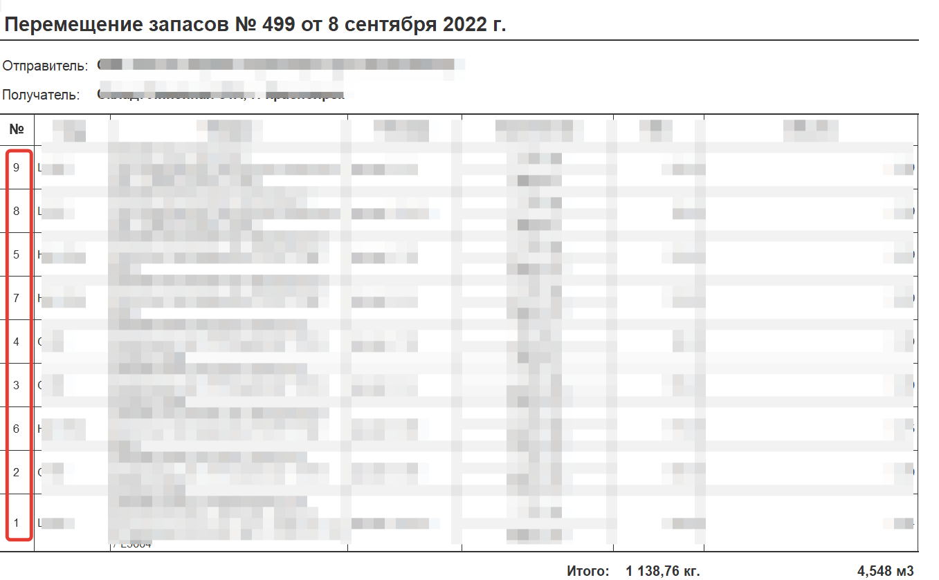 Внешняя форма Перемещения Запасов - упорядочить запасы по номеру