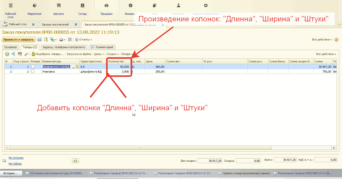 "Длинна", "Ширина" и "Штуки". В документе "Заказ покупателя" есть колонка "Количество".