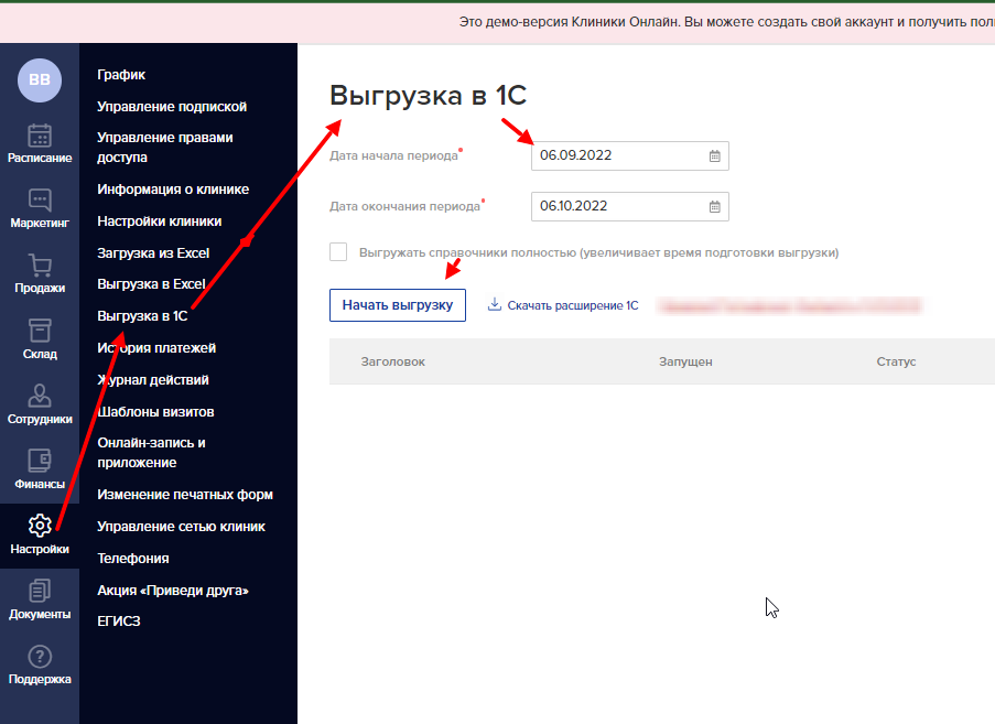 2) настройки, выгрузка в 1с