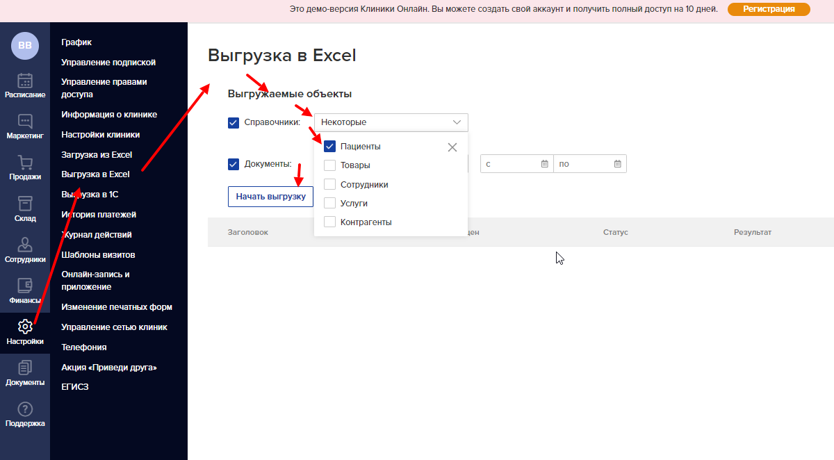 1) Можно пройти в раздел Настройки, Выгрузка в Excel, выбираем справочник "клиенты" и нажмите "начать выгрузку"