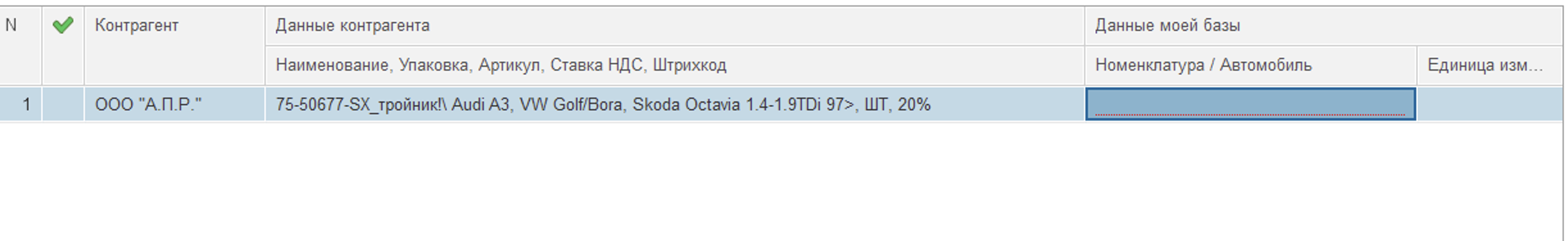 1)От контрагента (поставщика) поступают документы. При сопоставлении номенклатуры не ставится единица, проблема только с 1м контрагентом.