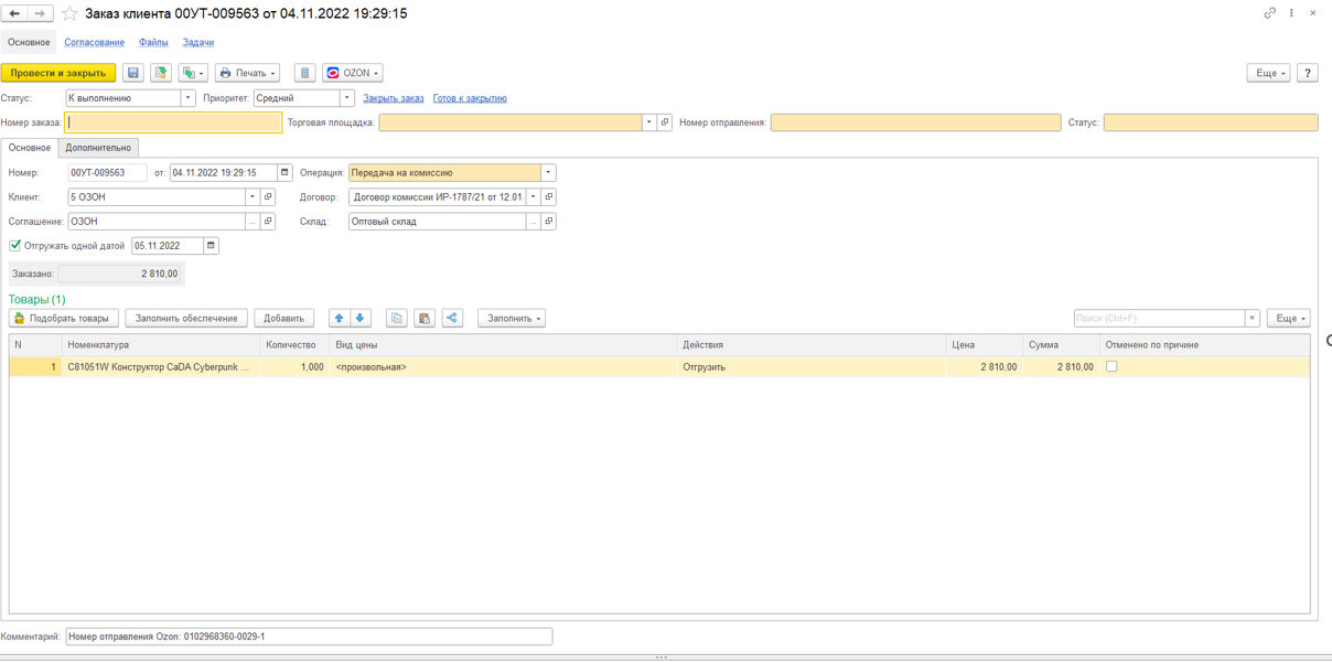 Есть расширение ОЗОН Synhrozon, которое по api загружает информацию из личного кабинеты в 1с (облачная ут 11.4.14.95 ) и на основании отправлений в 1С создает заказ клиента. Но почему то у этого расширения (типовое от ОЗОН) номер отправления указывается в комментарии .